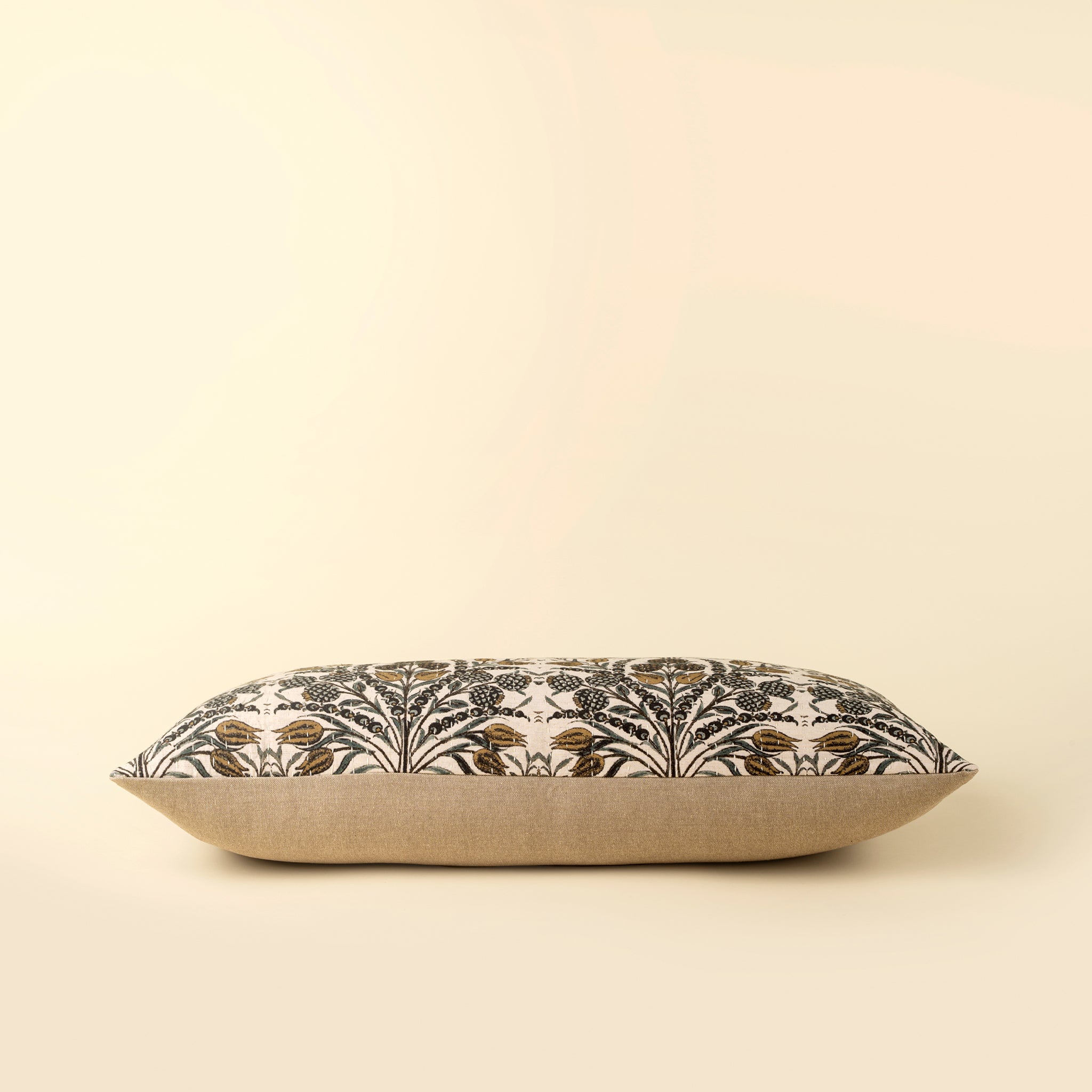 Add artisan texture and bold pattern to your space with the Tropicana Kantha Pillow. This lumbar cushion features a digitally printed design in rich tones of gold, charcoal, and teal on a flecked cotton base, bringing vibrant character to decorative pillows for the bed or sofa. Each one is hand-stitched with kantha embroidery by women artisans working in a home-based cottage industry, with detailed manual stitching that adds a soft, textural finish. Perfect for layering across a bed, it’s a beautiful way to celebrate craftsmanship and sustainable style.