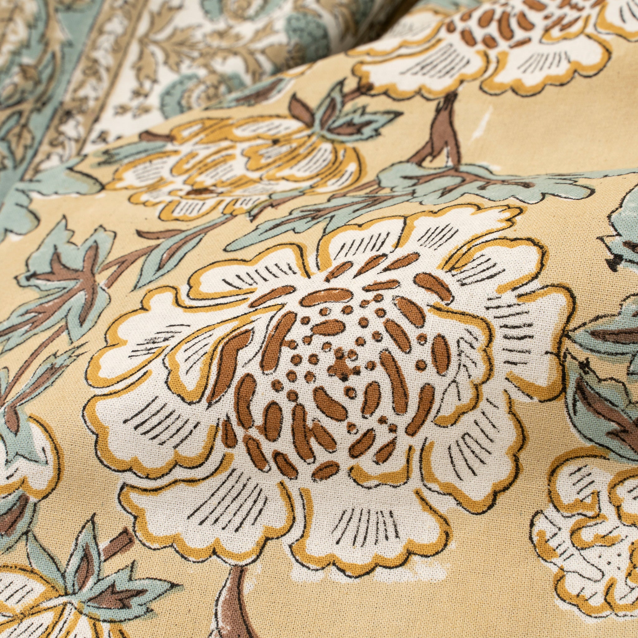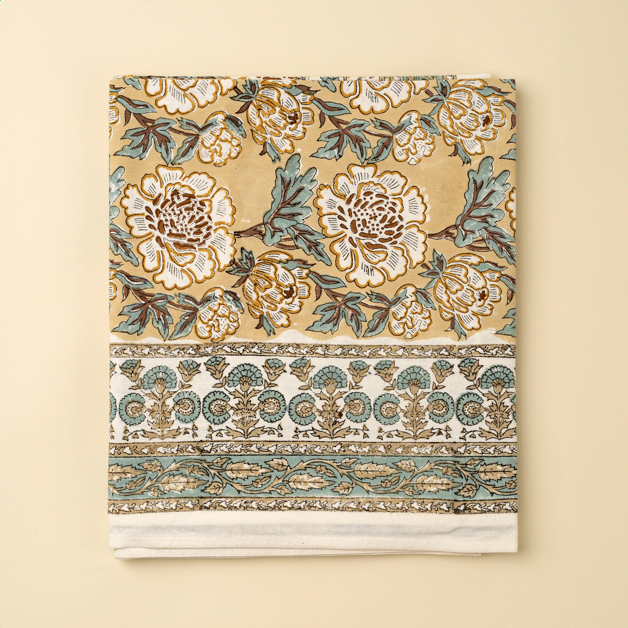 Set a warm and welcoming table with the Lirien Block Print Tablecloth. Hand block printed in India by skilled artisans, this 100% cotton tablecloth features bold floral designs in sandy-rimmed white and gold ochre with sage green leaves on a golden ground. The intricate botanical border adds a refined finishing touch, framing the print with timeless elegance. Whether for everyday meals or festive gatherings, this tablecloth offers a beautiful expression of traditional crafting methods and sustainable design.
